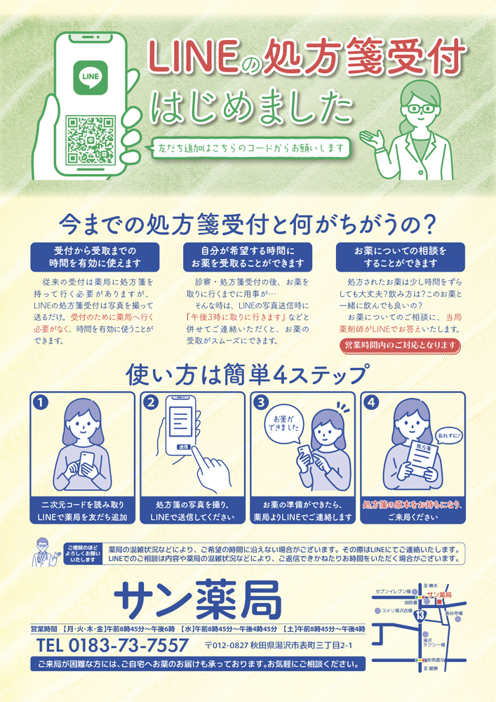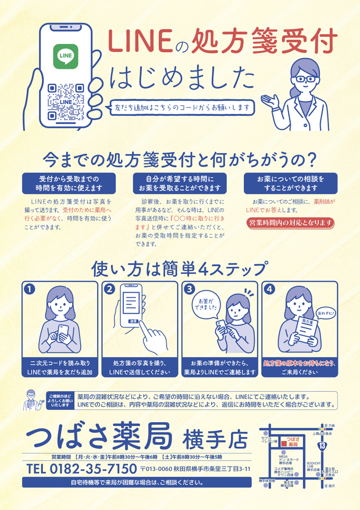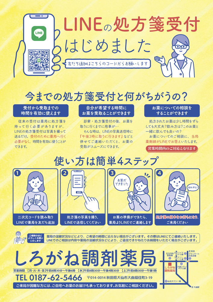 詳細は当ページ内、各調剤薬局の【LINE処方せん受付チラシ】をご覧ください。